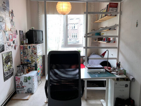 De keuken en de 2 badkamers, 2 toiletten en het terras worden gedeeld met 5 medestudenten.