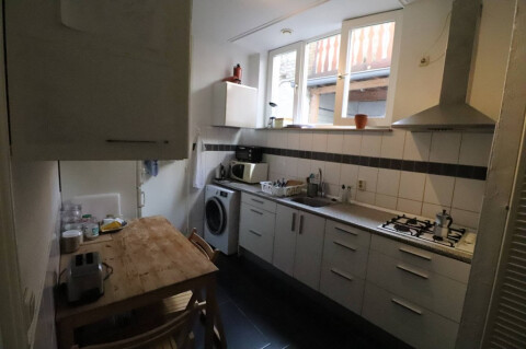 De studentenwoning beschikt ook over een wasmachine die net zoals de keuken en badkamer gedeeld worden met drie medebewoners.
